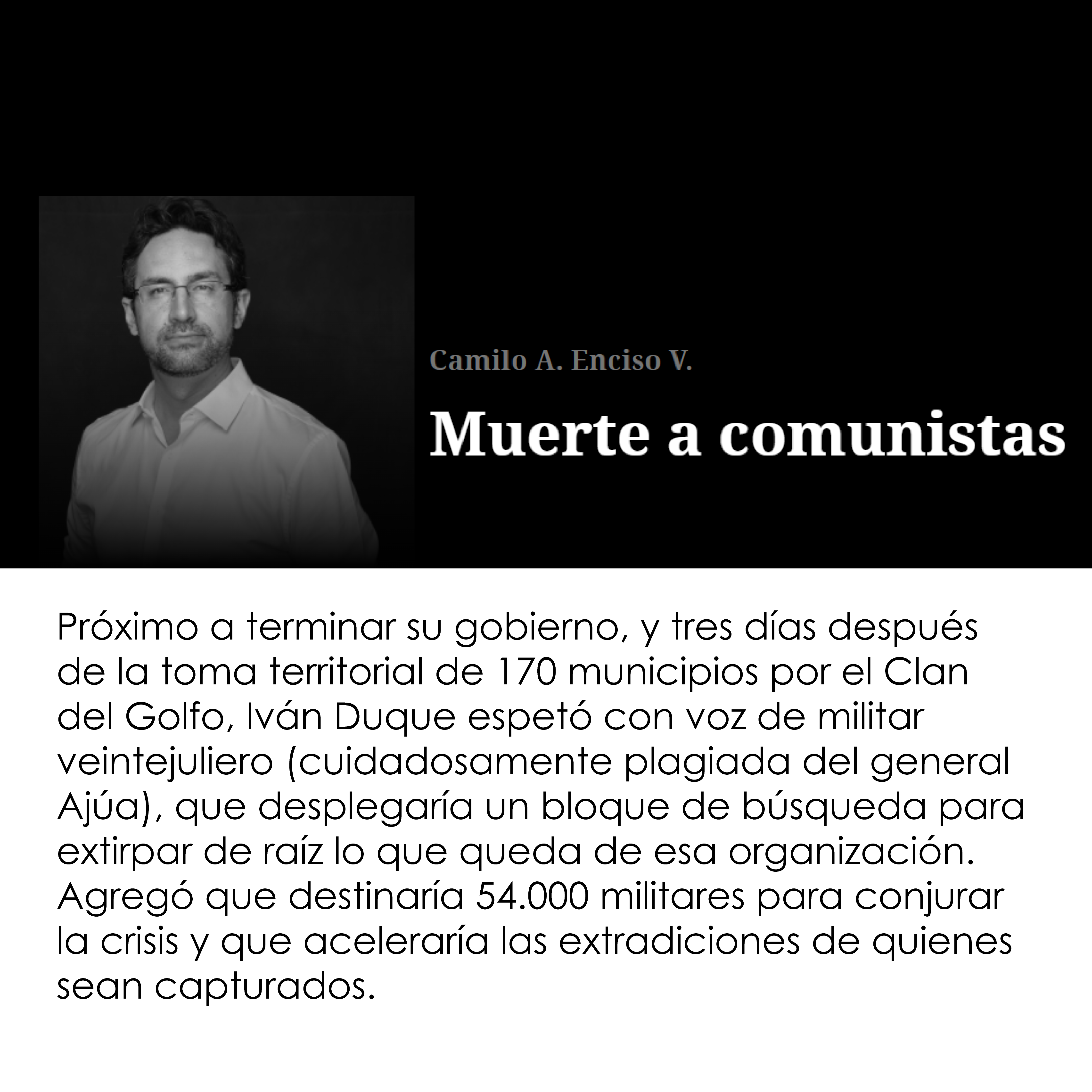 Próximo a terminar su gobierno, y tres días después de la toma territorial de 170 municipios por el Clan del Golfo, Iván Duque espetó con voz de militar veintejuliero (cuidadosamente plagiada del general Ajúa), que desplegaría un bloque de búsqueda para extirpar de raíz lo que queda de esa organización. Agregó que destinaría 54.000 militares para conjurar la crisis y que aceleraría las extradiciones de quienes sean capturados.